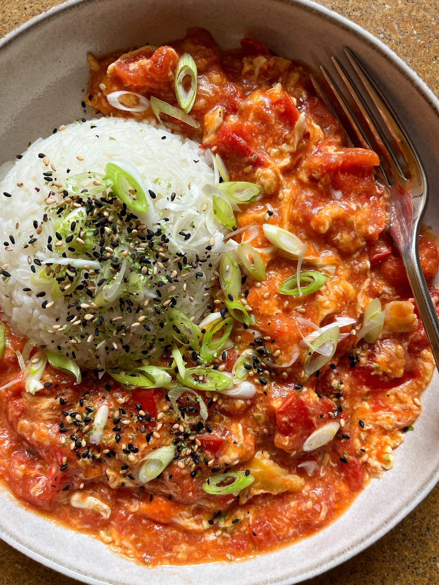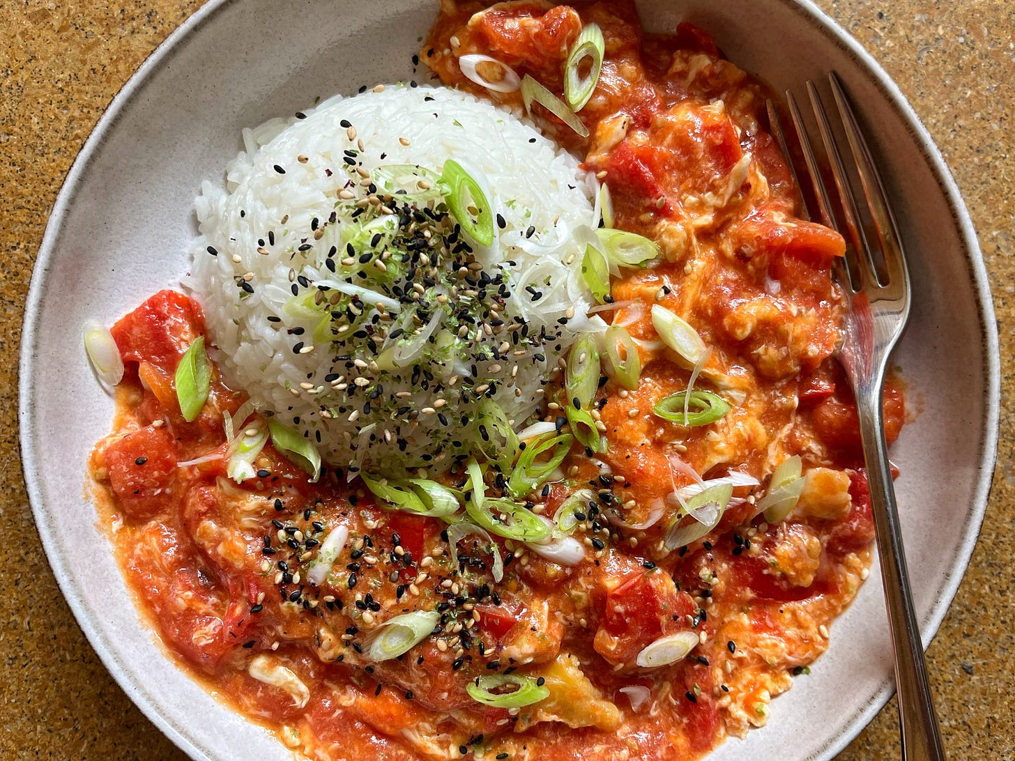 I’ve written the recipe for two, because I usually make it for just me and some recipes scaling down involve splitting an egg, and obviously, as they’re the main flavour, choose the very best ripe red tomatoes you can find (this recipe is a great way to use up slightly overripe ones!) I’ve also omitted the sugar found in some versions (good tomatoes don’t need it), fresh ginger (because whilst delicious that involves my microplane - ditto garlic - meaning an extra thing to wash up, and omitting it in laziness I realised I didn’t miss it), and white pepper because I know it is something people only have if they do a lot of authentic Chinese cookery. And because at the moment I’m going through a phase where I’m finding it overpowering in even recipes a previous version of myself wrote.